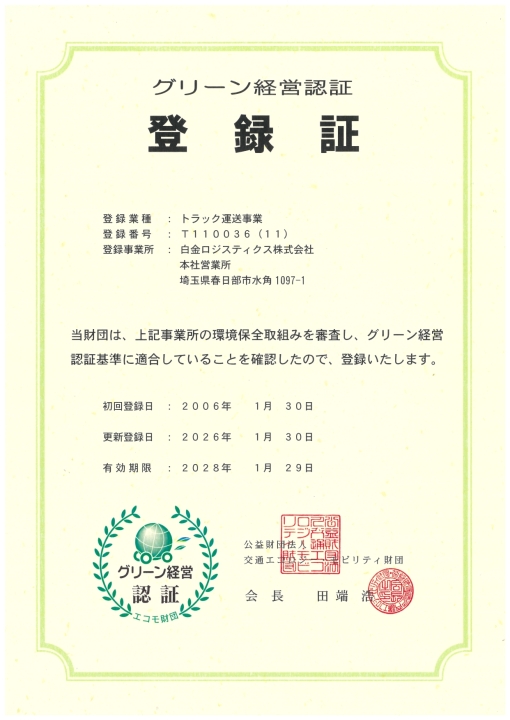 安全性優良事業所の認定を受けお客様の大切なお荷物を安全・迅速・確実に輸送いたします。